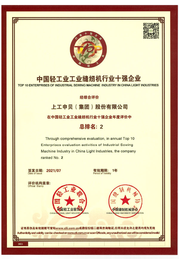 Top 10 Enterprises of Industrial Sewing Machine in China Light Industry (Range 2)