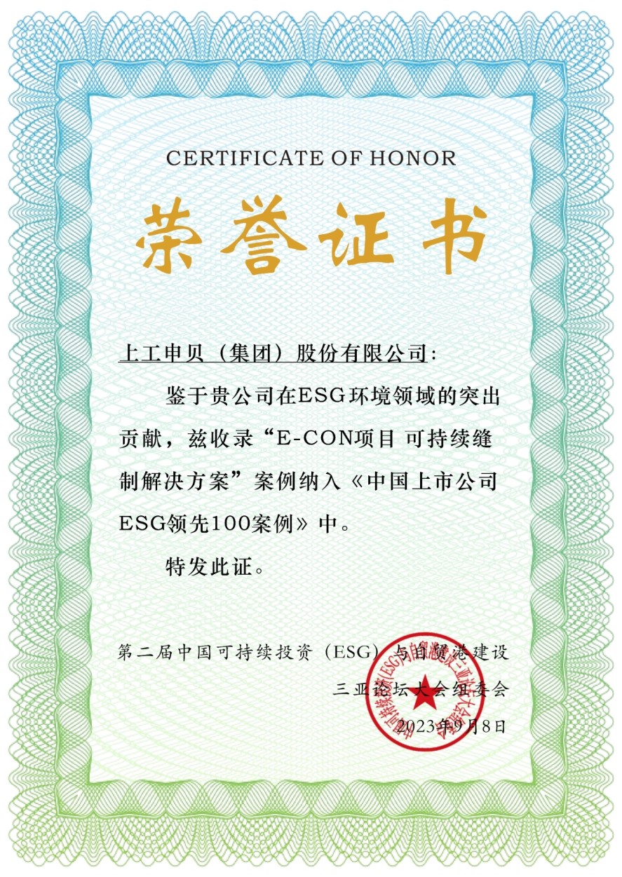 Recently, the second Sustainable Investment and Financing (ESG) and Free Trade Port Construction Forum was held in Sanya, Hainan. The forum was jointly hosted by the China Federation of Industrial and Economic Cooperation and invited over a hundred listed companies and dozens of investment institutions to participate. This forum has launched the "China ESG Development Index Report" for the first time, which comprehensively reflects the ESG information disclosure, ESG performance of listed companies in China, as well as the ESG development index situation of industries and regions. At the same time, the "Top 100 ESG Cases of Chinese Listed Companies" will be released to showcase the successful experience and responsible business models of excellent listed companies in sustainable development, enhance the market value and financing capabilities of Chinese listed companies, and win higher reputation and competitiveness globally Among them, Shanggong Shenbei's "E-CON Project Sustainable Sewing Solution" was selected as a typical case of "Serving the Dual Carbon Strategy Goal" in the "ESG Leading 100 Cases of Chinese Listed Companies"
