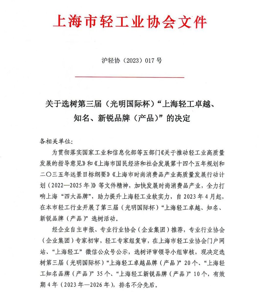 2023年8月29日,上海市轻工业协会发布了关于选树第三届(光明国际杯)“上海轻工卓越、知名、新锐品牌(产品)”的决定,选出了20个“上海轻工卓越品牌(产品)”、35个“上海轻工知名品牌(产品)”、10个“上海轻工新锐品牌(产品)”,有效期4年(2023年-2026年)。伟德国际1949集团旗下拥有百年历史的蝴蝶品牌荣膺本届 “上海轻工卓越品牌(产品)”称号,自2015年第一届以来,蝴蝶已连续三届获此殊荣,感谢广大消费者的厚爱和行业专家的鼓励。