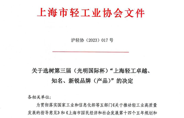 2023年8月29日,上海市轻工业协会发布了关于选树第三届(光明国际杯)“上海轻工卓越、知名、新锐品牌...
